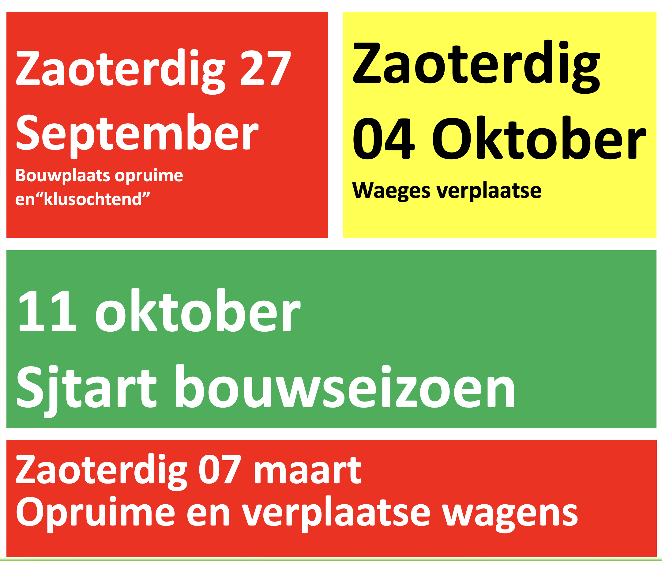 In de veurbereiding zal de bouwplaats waere opgeruimd en de waeges op de plaats gezat.